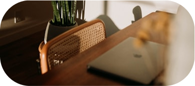 Laptop on wooden desk with chair and indoor plant in sunlight.