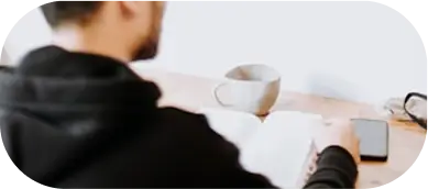 there is a man sitting at a desk with a laptop and a cup of coffee
